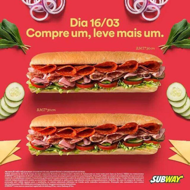 Preparem-se amantes dos sanduíches Subway hoje tem promoção deliciosa! 'Compre um. Ganhe outro'. Neste dia, o cliente que comprar um sanduíche (de 15 cm ou 30 cm) poderá ganhar outro igual no mesmo sabor e tamanho.