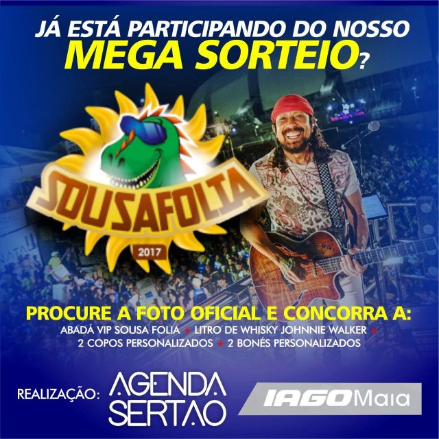 Em comemoração a super parceria firmada entre o seu portal de entretenimentos e o maior Instagram de divulgação do sertão, o portal Iago Maia e o Agenda Sertão estão realizando um super sorteio que te levará para curtir o maior evento da Paraíba, o Sousa Folia 2017, totalmente de graça, isso mesmo, a super promoção premiará o ganhador com o melhor kit folia: